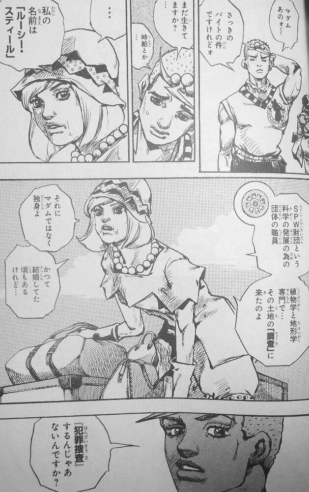 老婦人の名は「ルーシー・スティール」。科学の発展のための団体「スピードワゴン財団」から、植物学や地形学の見地から「その土地」の調査に来たと言います。